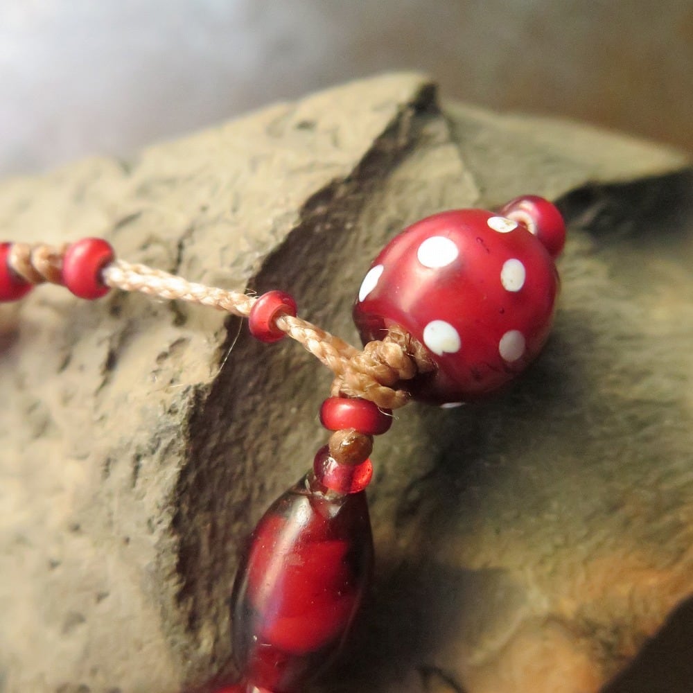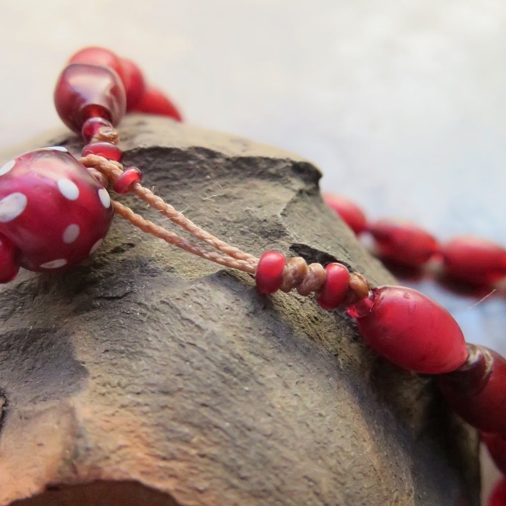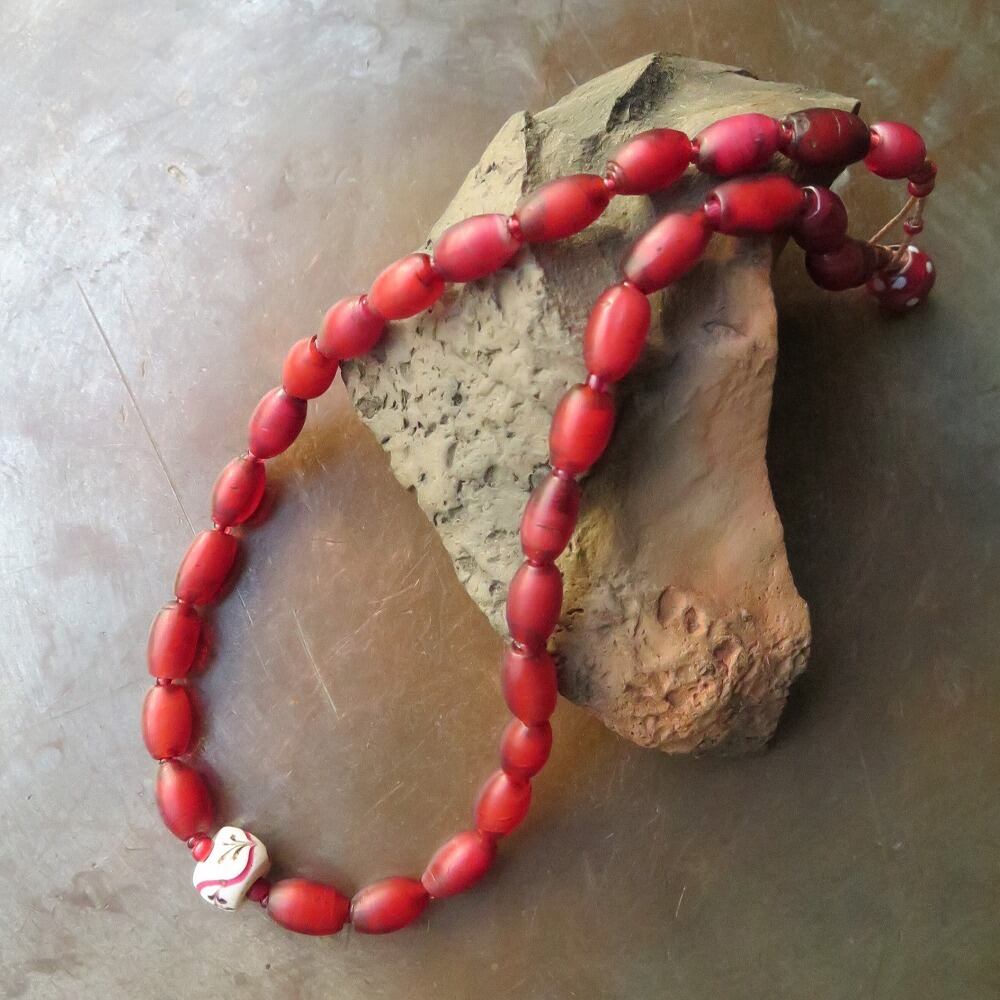 全体は、サンブルと呼ばれる紡錘形の金赤ホワイトハートと、同じ金赤のシードビーズでつなぎました。