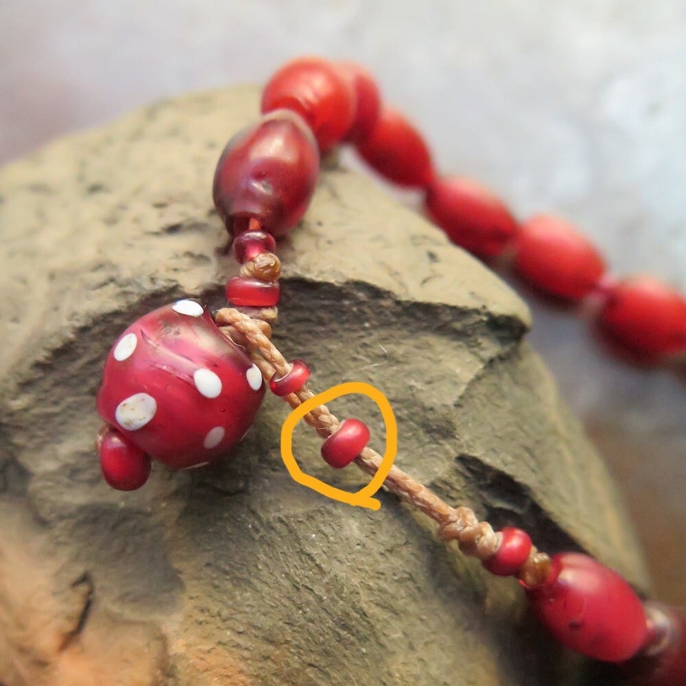 黄色で囲った部分のビーズが動くので、留めのビーズを透したらループを小さく絞ることが出来ます。