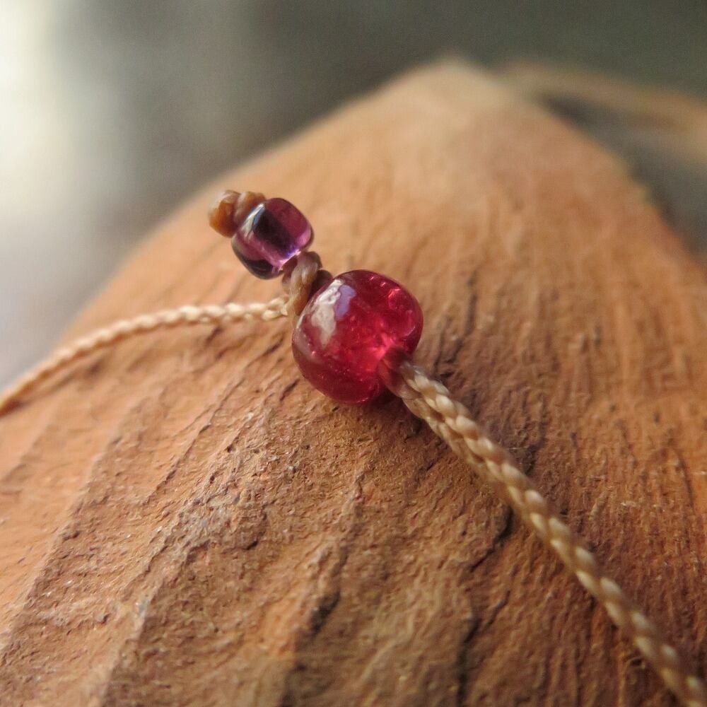 紐の端にも・・・としたかったのですが、サイズ的に丁度良い金赤が無いので、紫のシードビーズを使用しました。