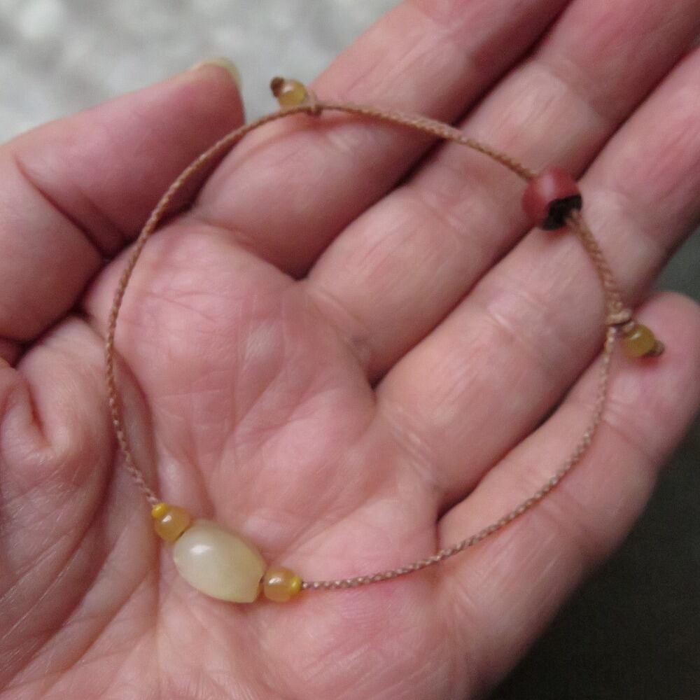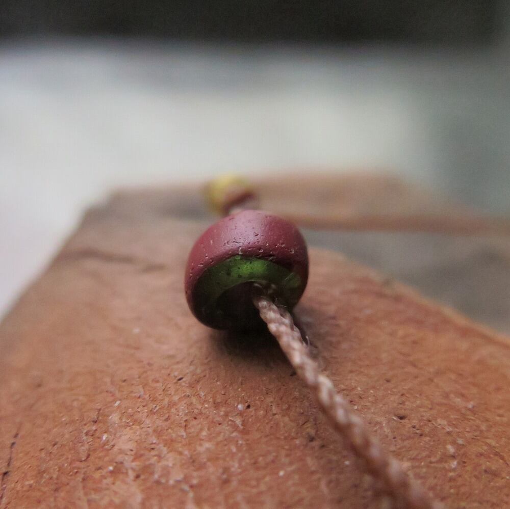 紐の先端にも蜂蜜色のシードビーズを使用しました。