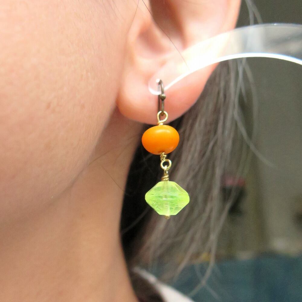 瑞々しいレモンイエローのウランガラスと、蜜柑のようなオレンジ色のボヘミア玉のピアス&イヤリングです。