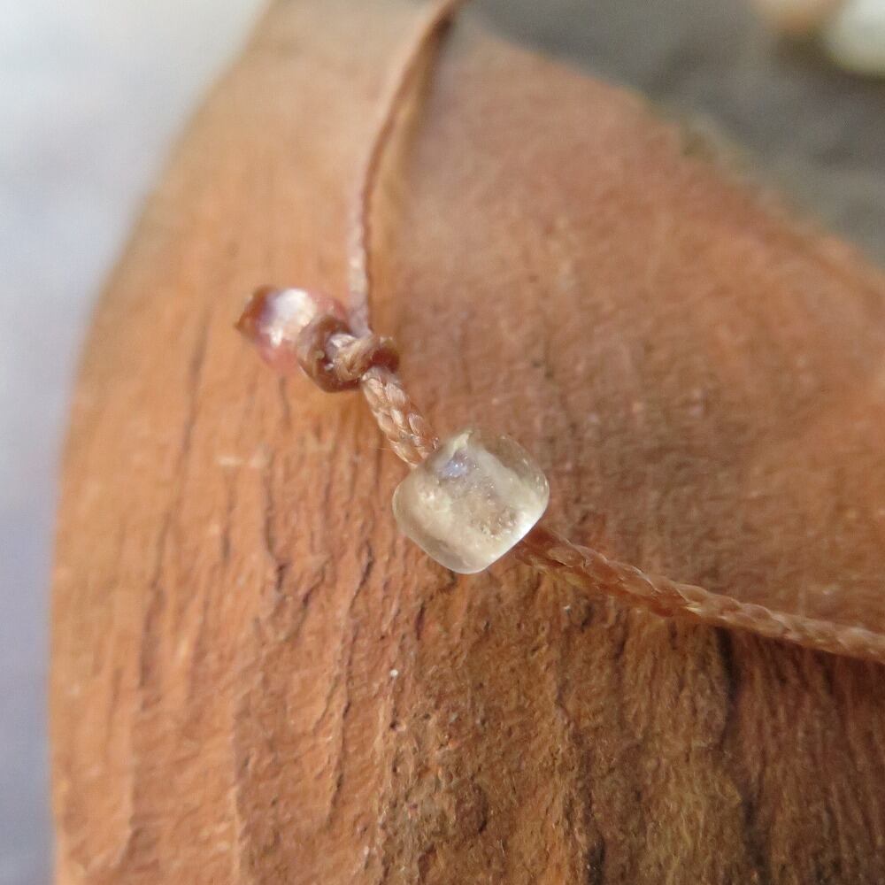二本の紐をまとめるのは、透明のヴェネチアンシードビーズ。