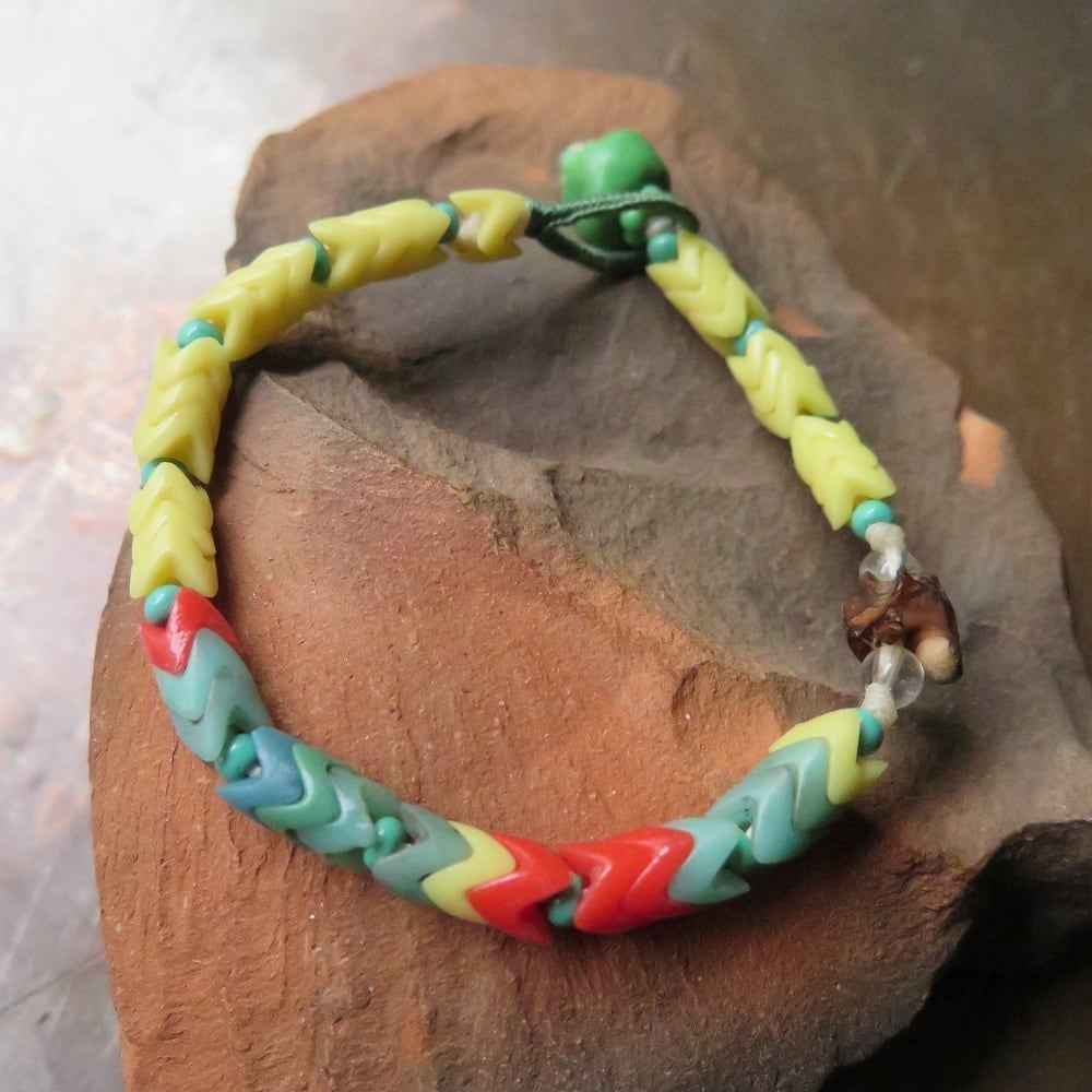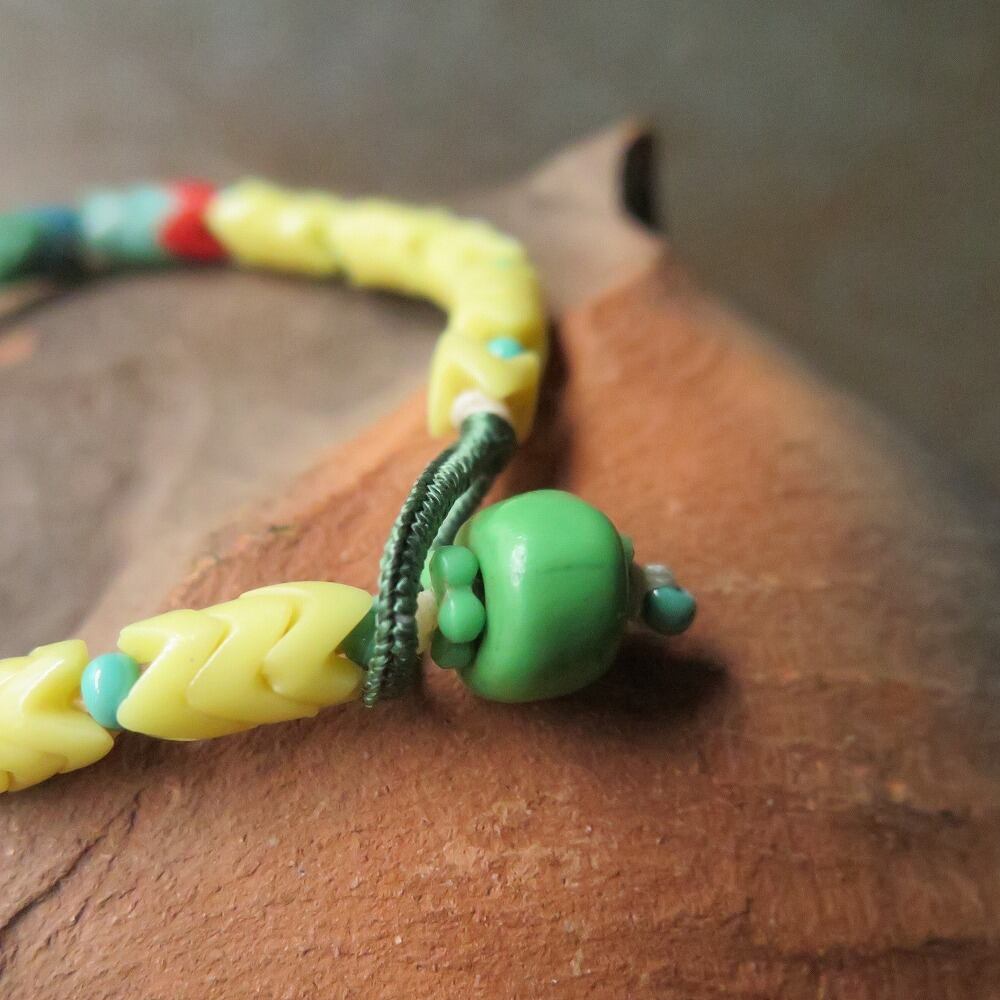 淡い黄色のスネークビーズに、緑や赤のスネークビーズをミックス。