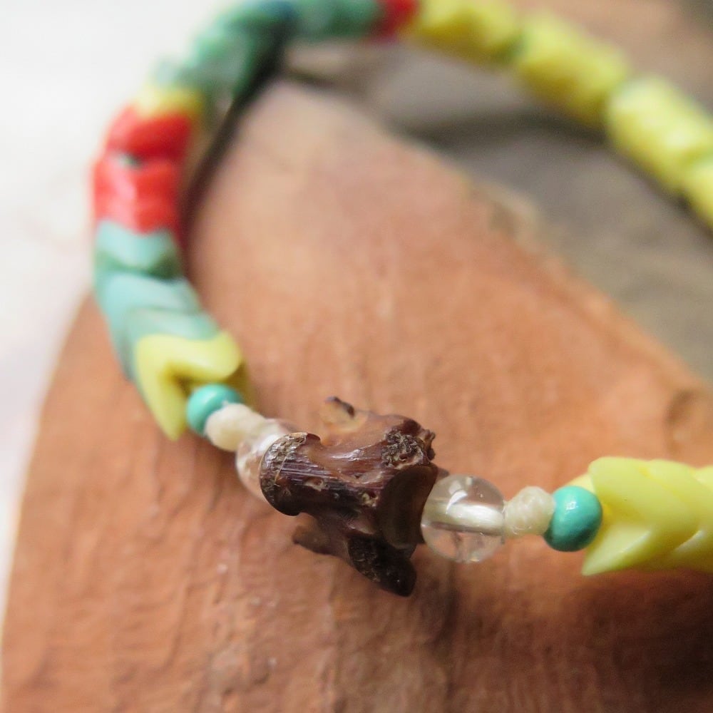 アフリカでお守りとして身に着けられていた蛇骨と、それを模してガラスで作られたスネークビーズ。