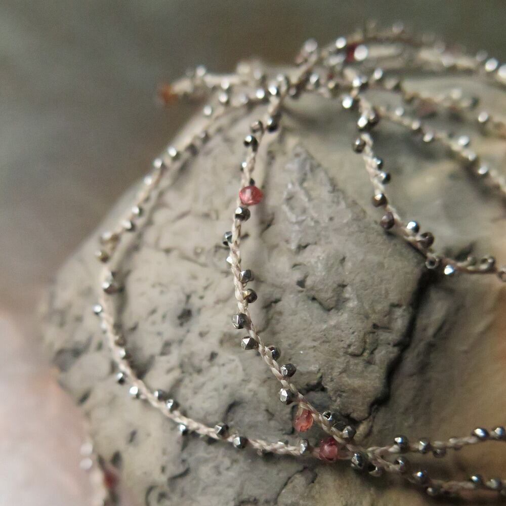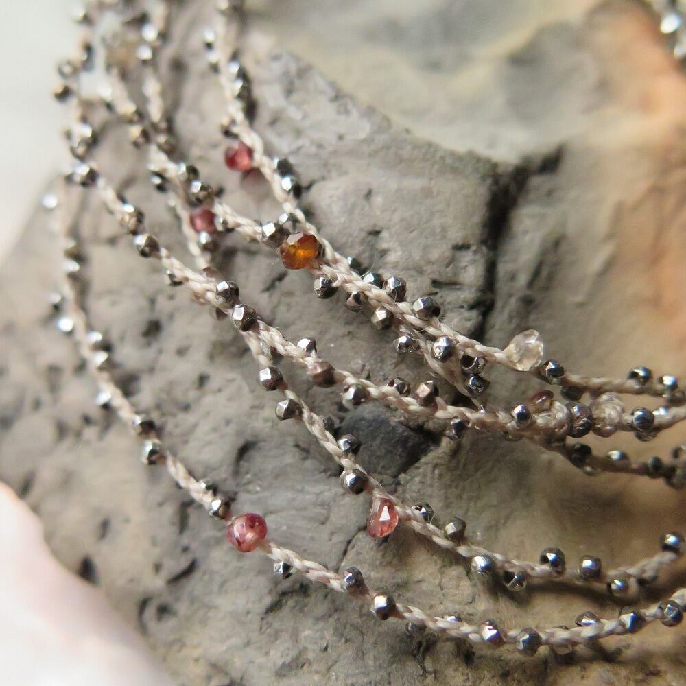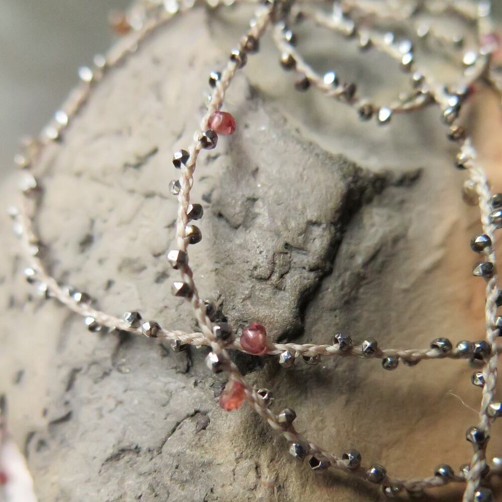 キラキラ輝くメタルビーズと、グレー~赤系のサファイアをカーキ色の蠟引き紐に編み込みました。