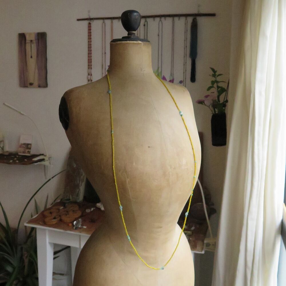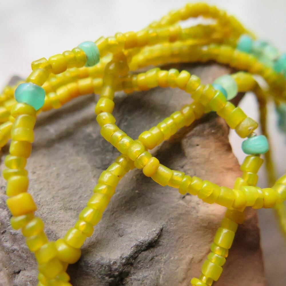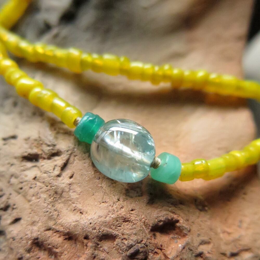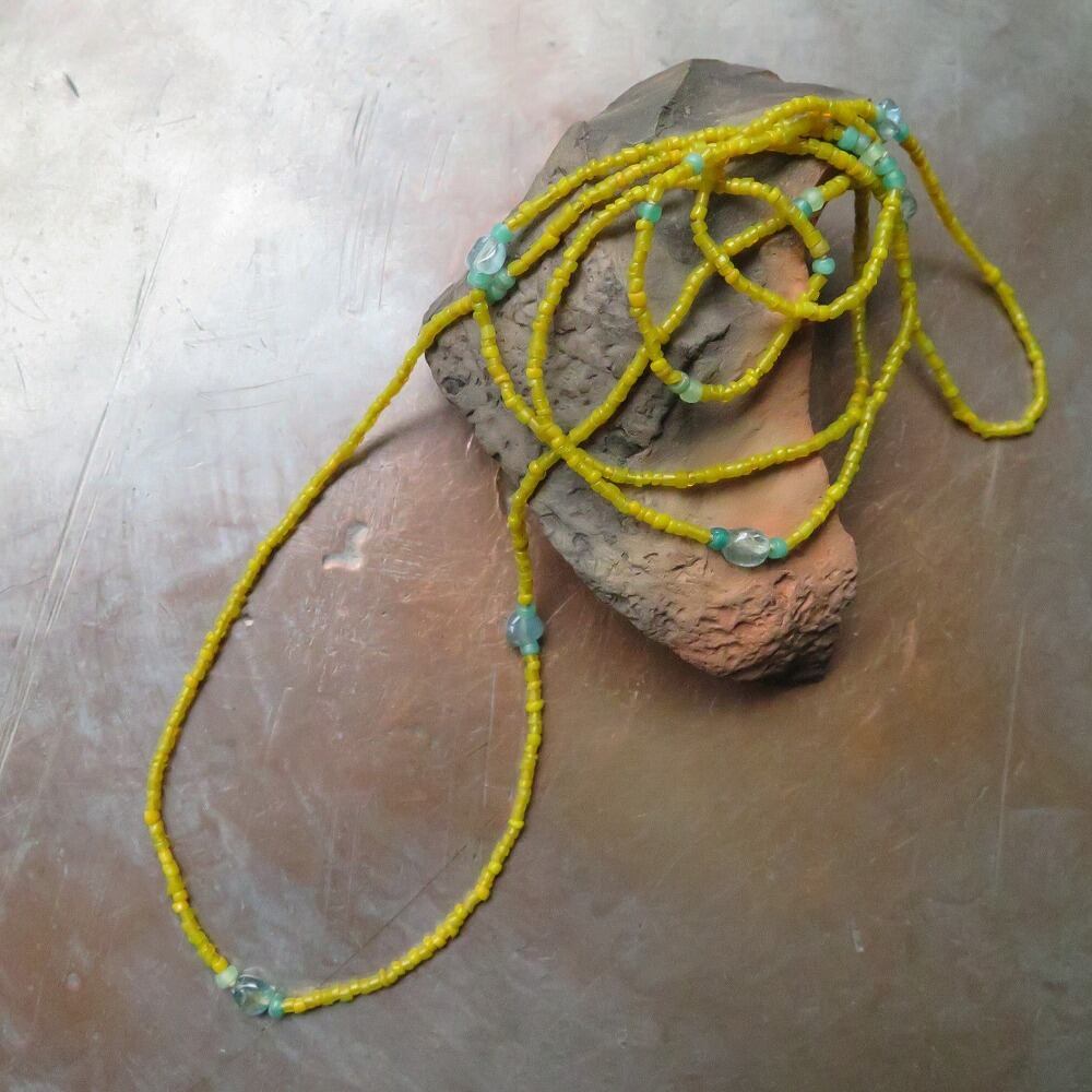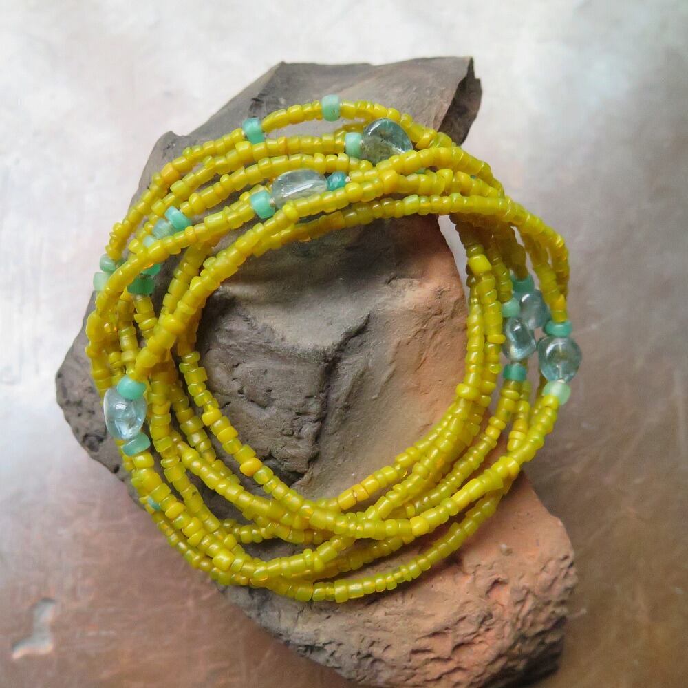黄色のインドシードビーズに、透明感のあるアパタイトと、小さなウランガラスのカカンバを合わせました。