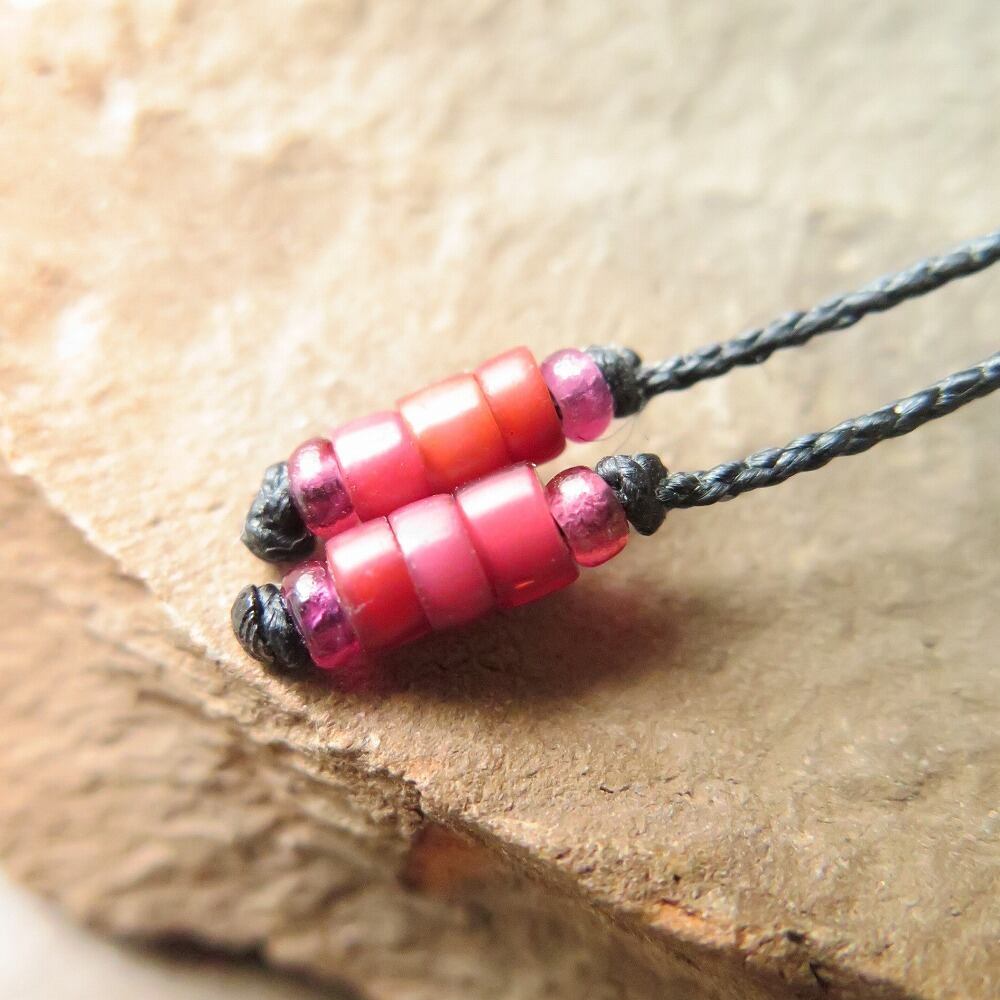 サイズ調整のビーズ、紐の先端も、同じ色合いのシードビーズ&ホワイトハートで仕上げています。