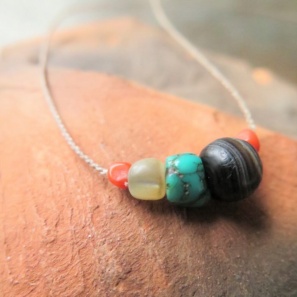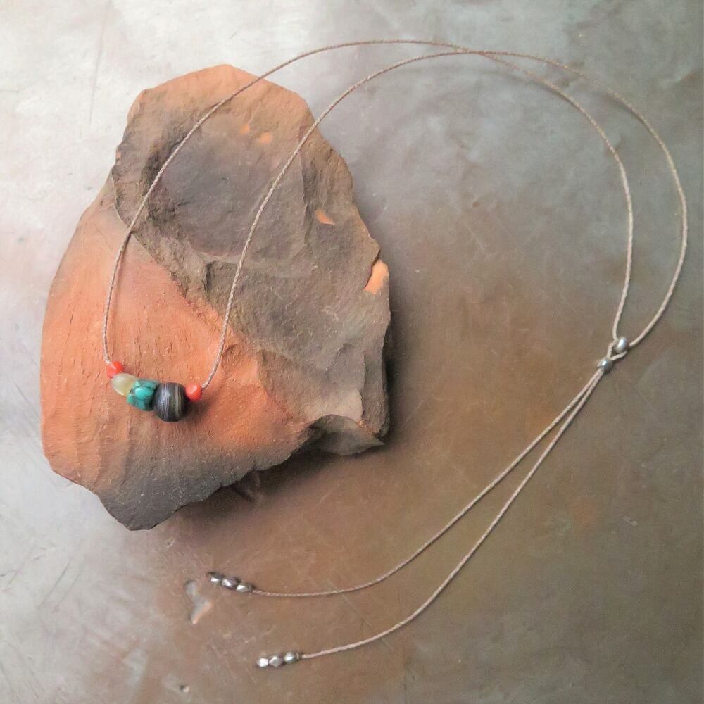 緒 薬師珠 + チベタンターコイズ&マザーオブパール&珊瑚&チンシルバー ネックレス