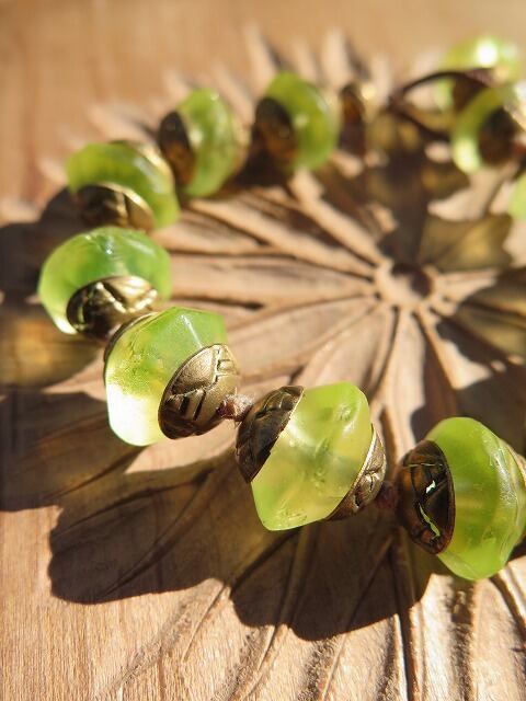 1800~1900年代初頭ボヘミアのウランガラスに真鍮の座金をあわせて繋ぎました。