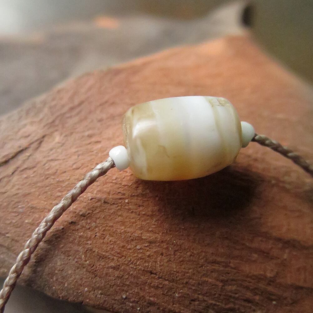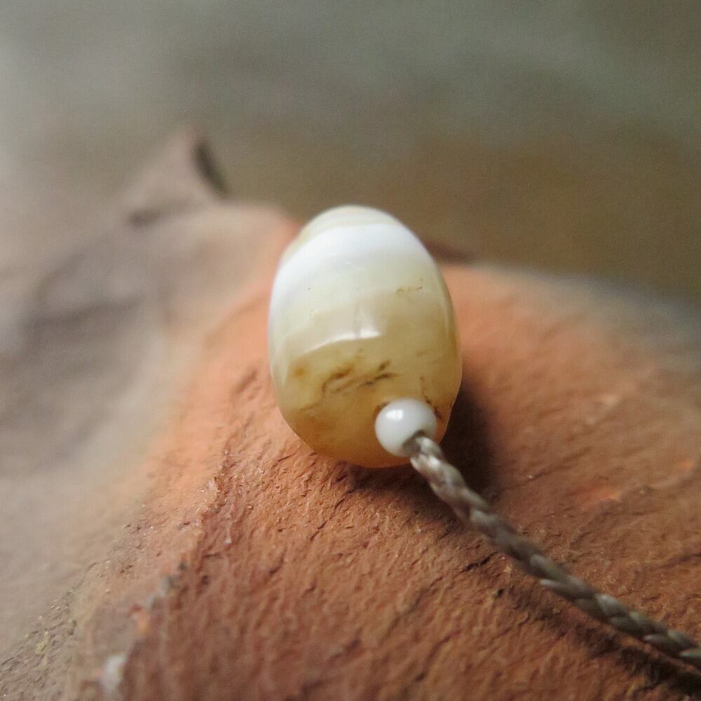 二本の蝋引き紐をまとめるビーズ、蝋引き紐の先端のビーズは、グーズベリー。