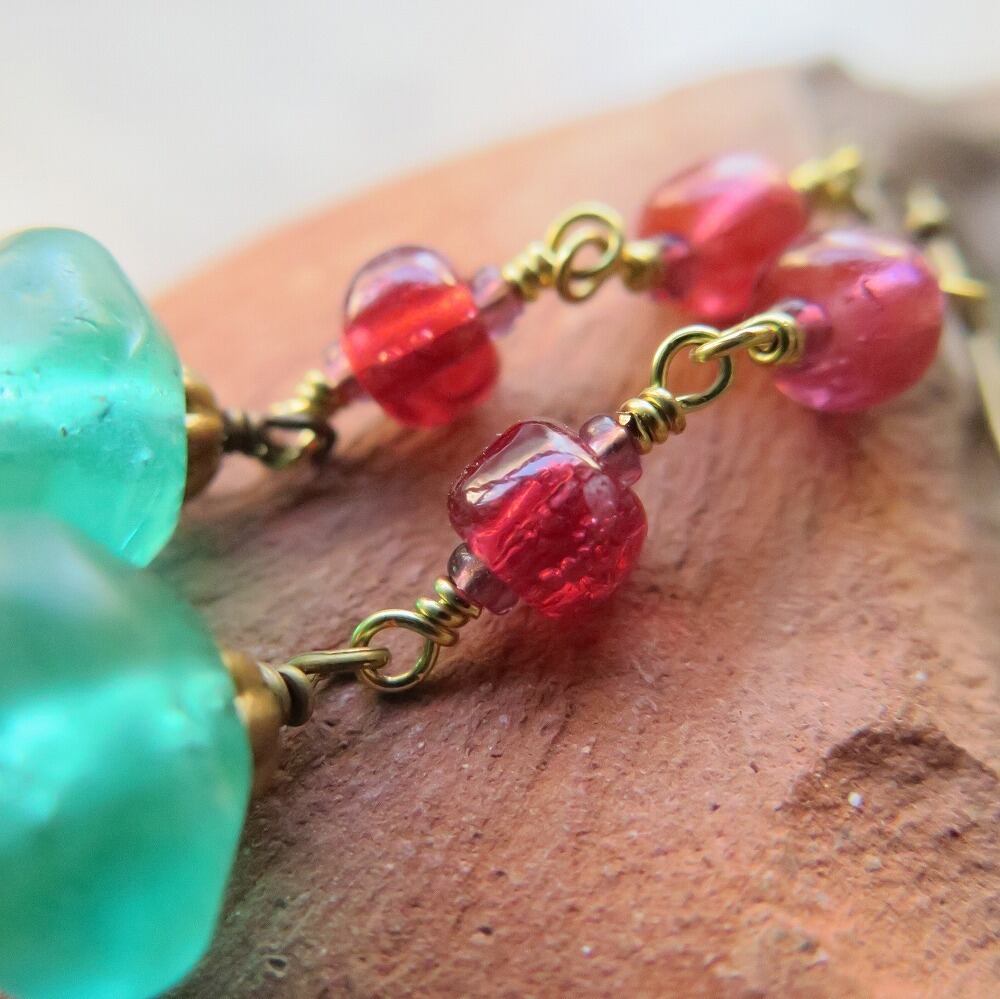 ウランガラス 緑 + 金赤 ピアス&イヤリング