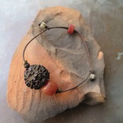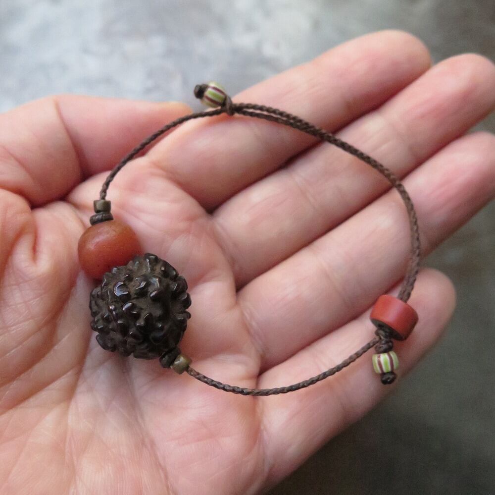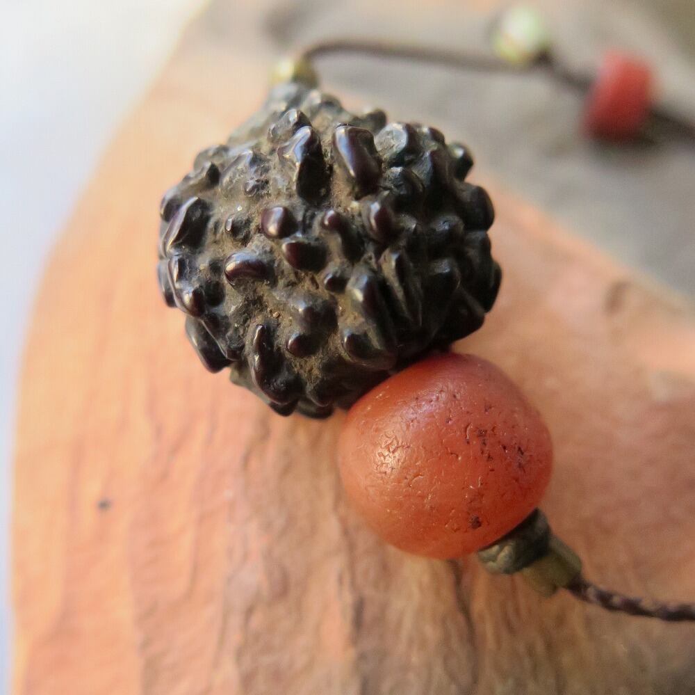 滑らかに摩耗したルドラクシャに、インドに伝わったカーネリアンを添えました。