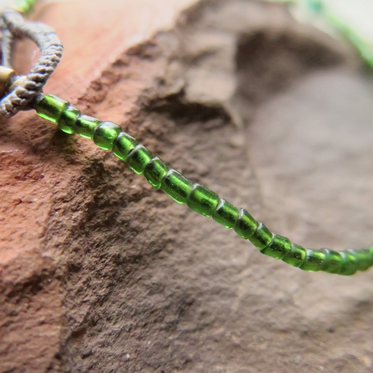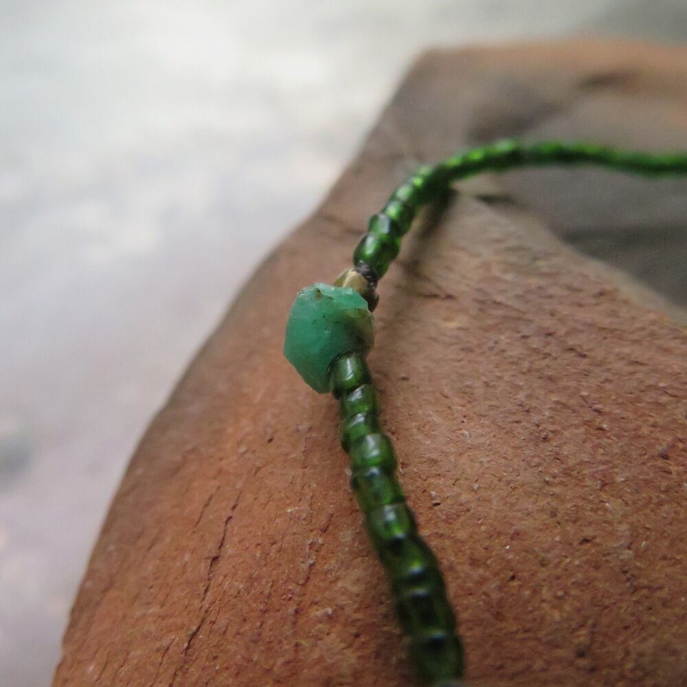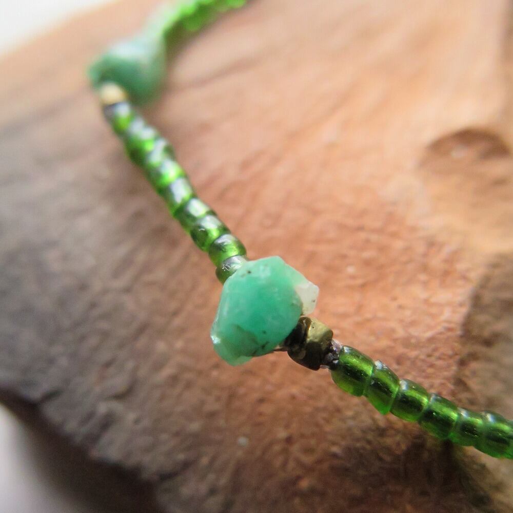 緑のインドシードビーズに、エメラルド&オリッサブラスを添えました。