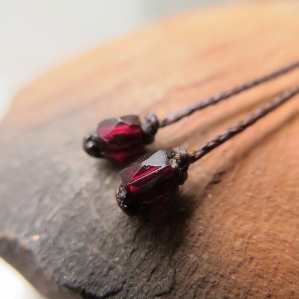 二本の紐をまとめるのは、金赤のシードビーズと紫のシードビーズ。