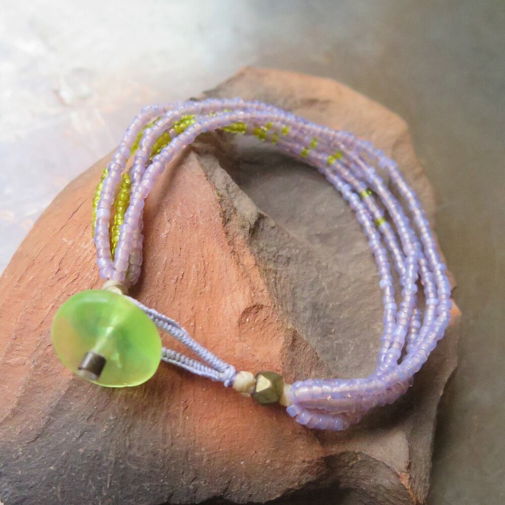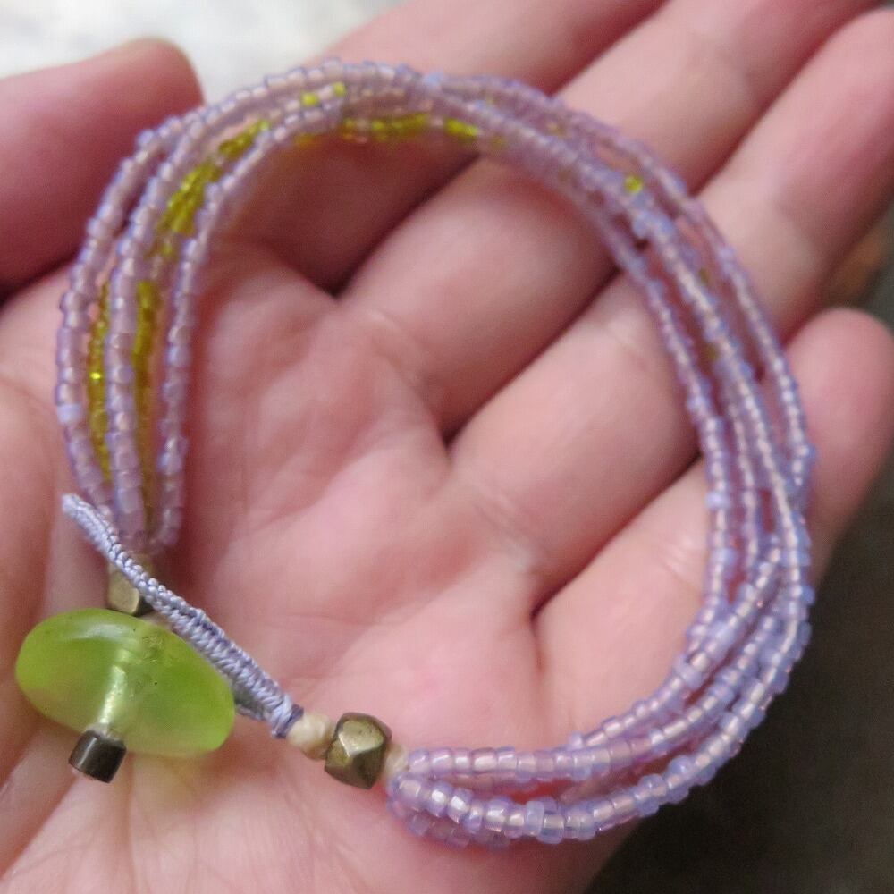 ヴェネチアンシードビーズ 紫 & 黄緑 + ウランガラス & オリッサブラス ブレスレット