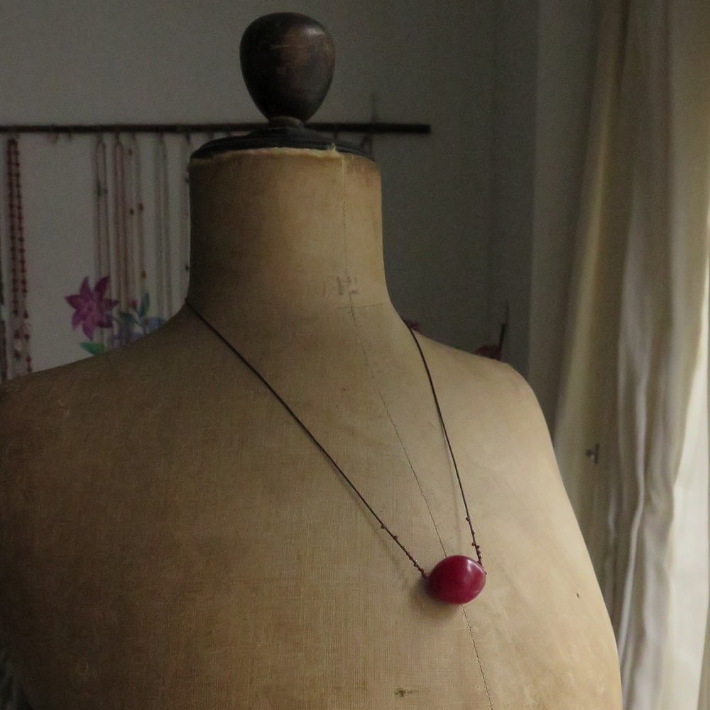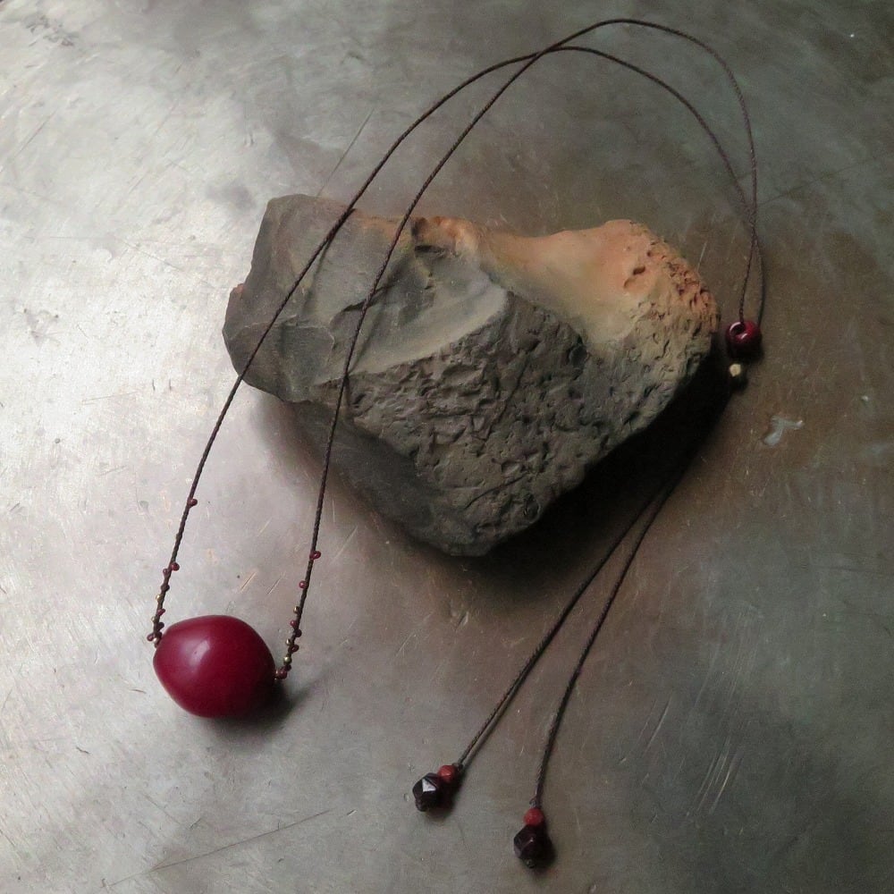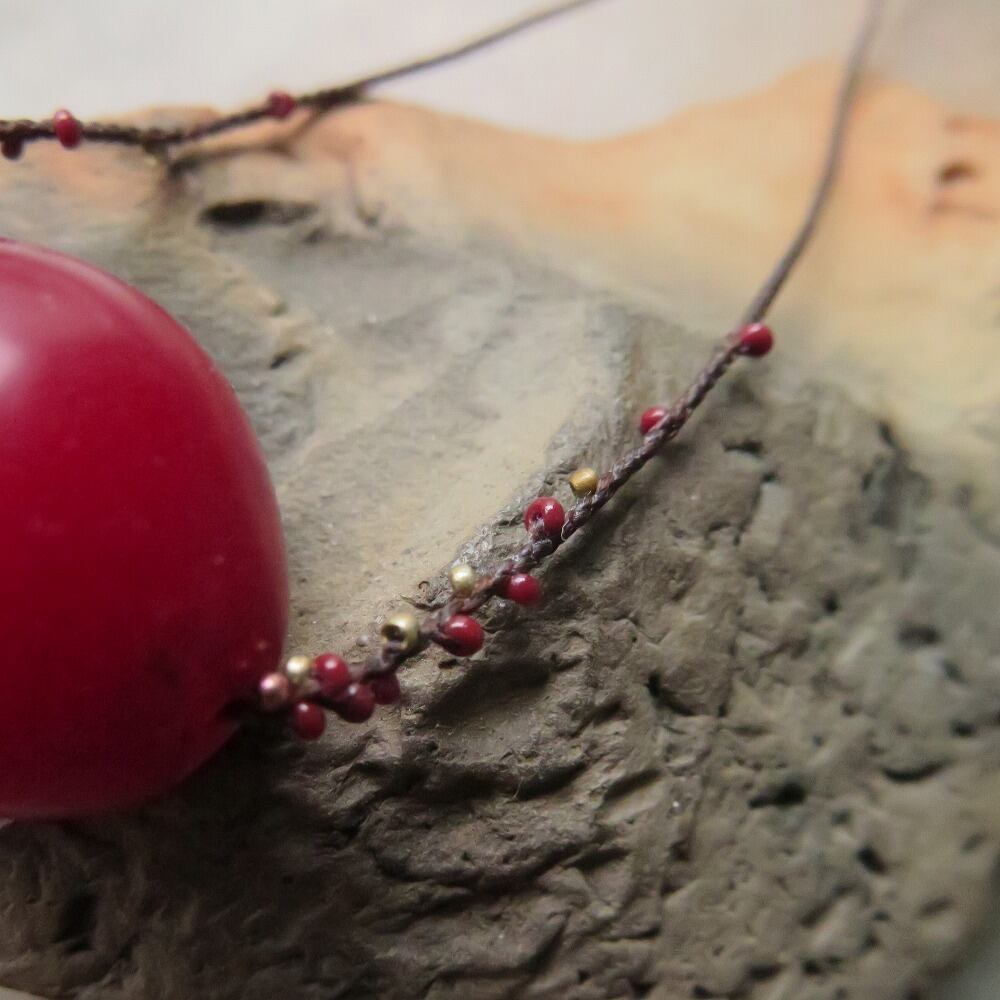 深い赤のエチオピアンチェリーをトップに、紐に小さなアンティークビーズを編み込みました。