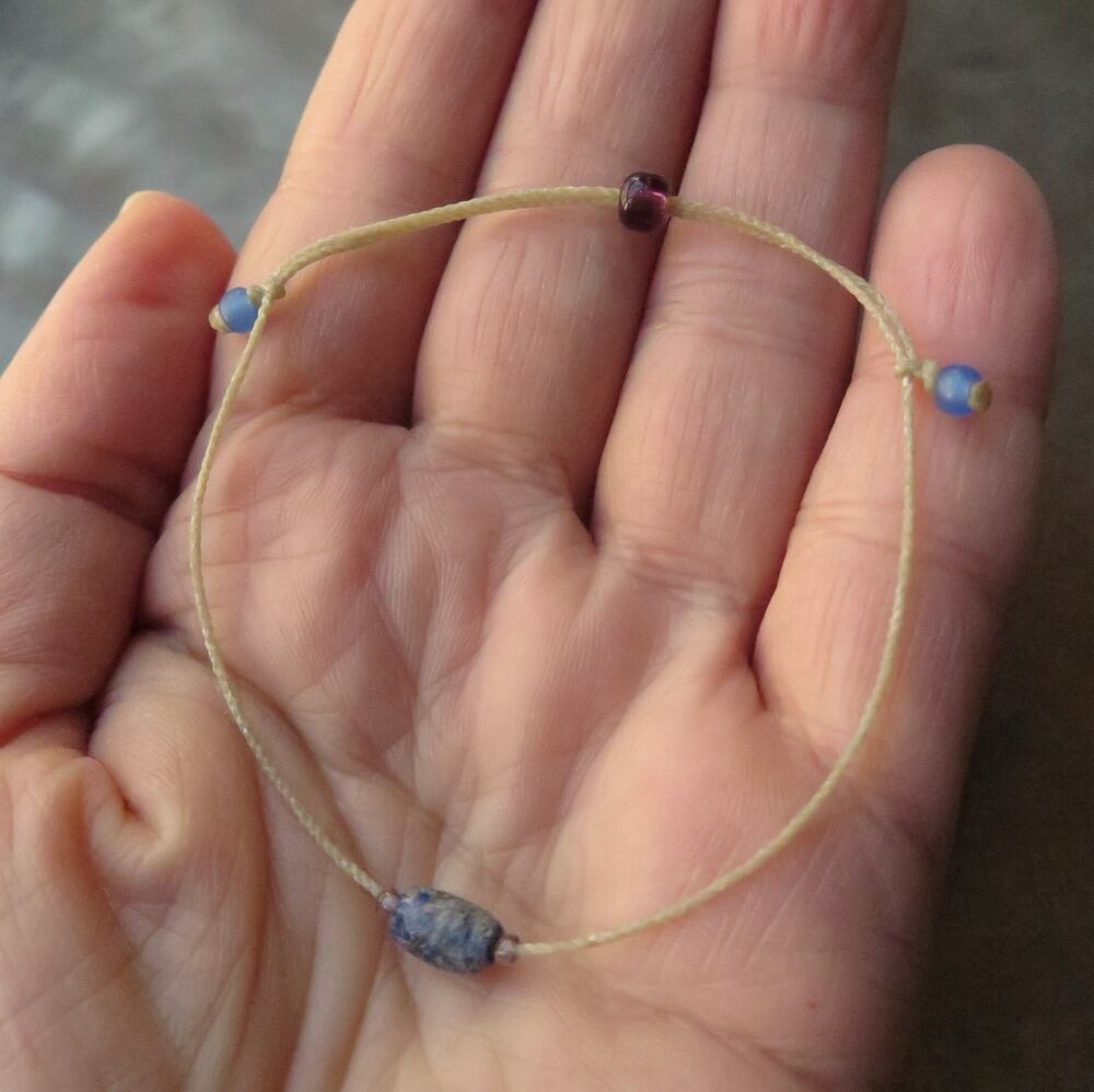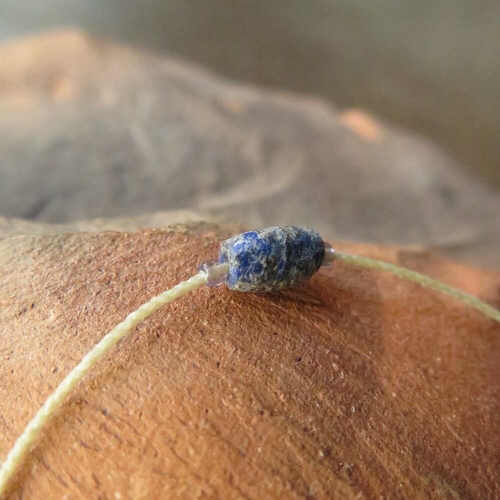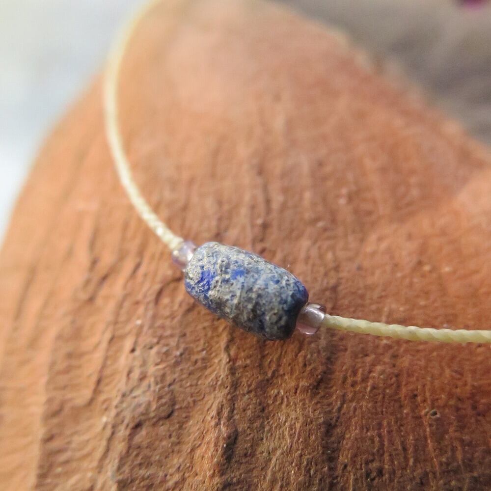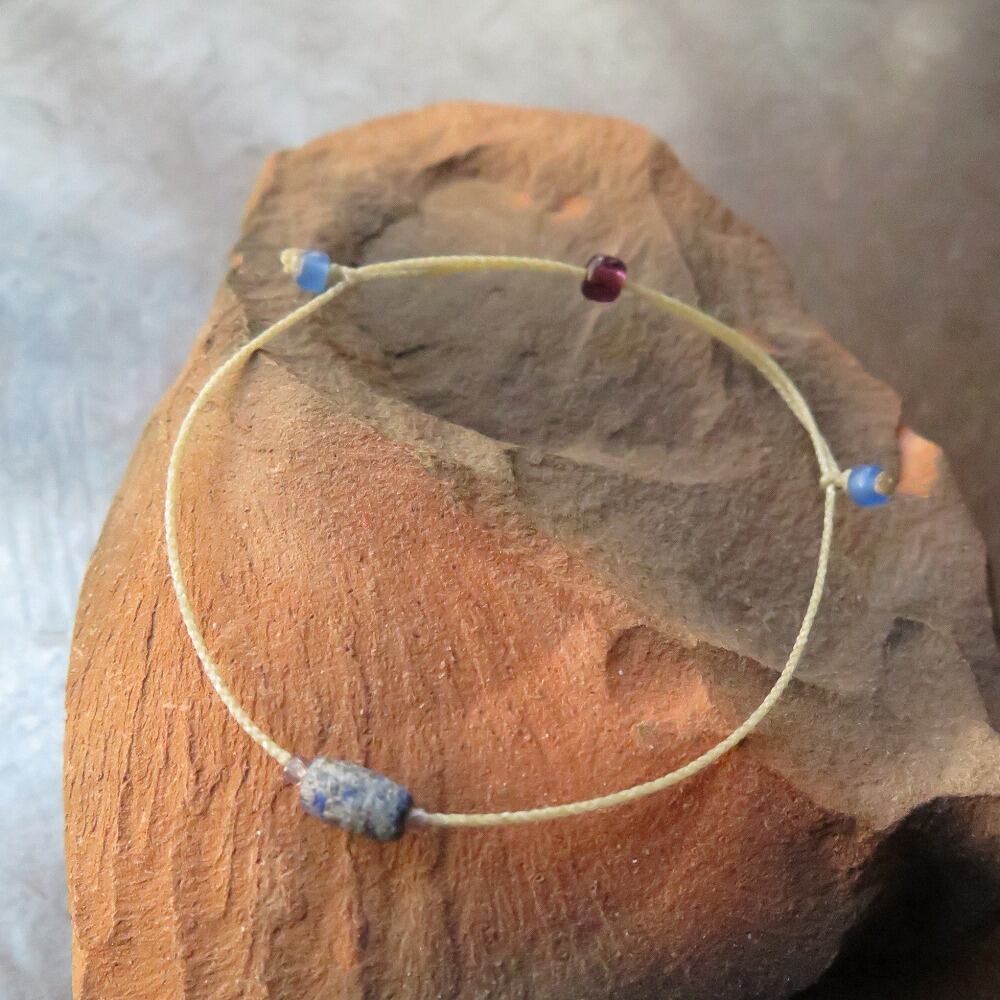 趣きある古代ラピスラズリを一粒、細い細い紐でブレスレットにしました。