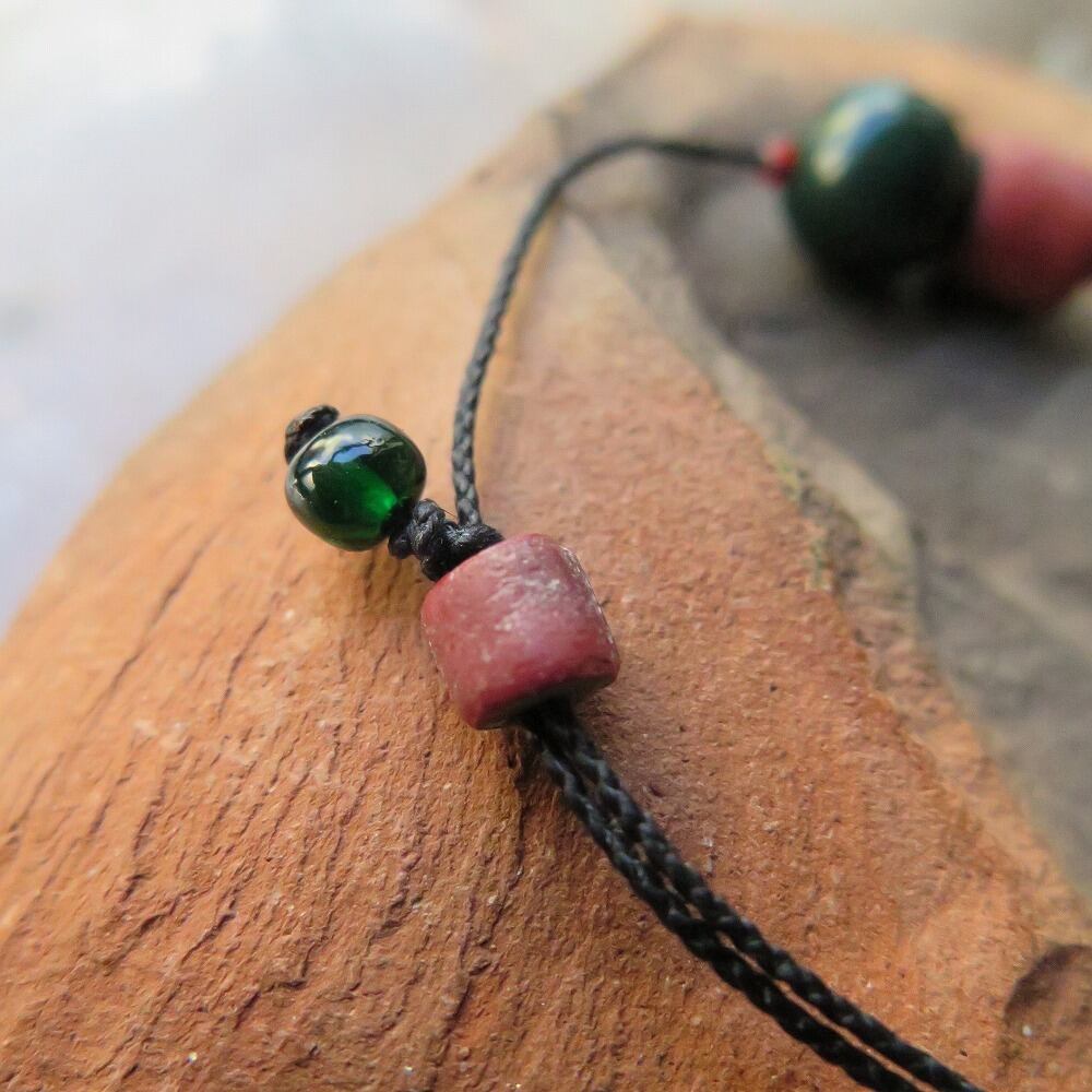 紐の先端には、深い緑のヴェネチアンシードビーズを使いました。