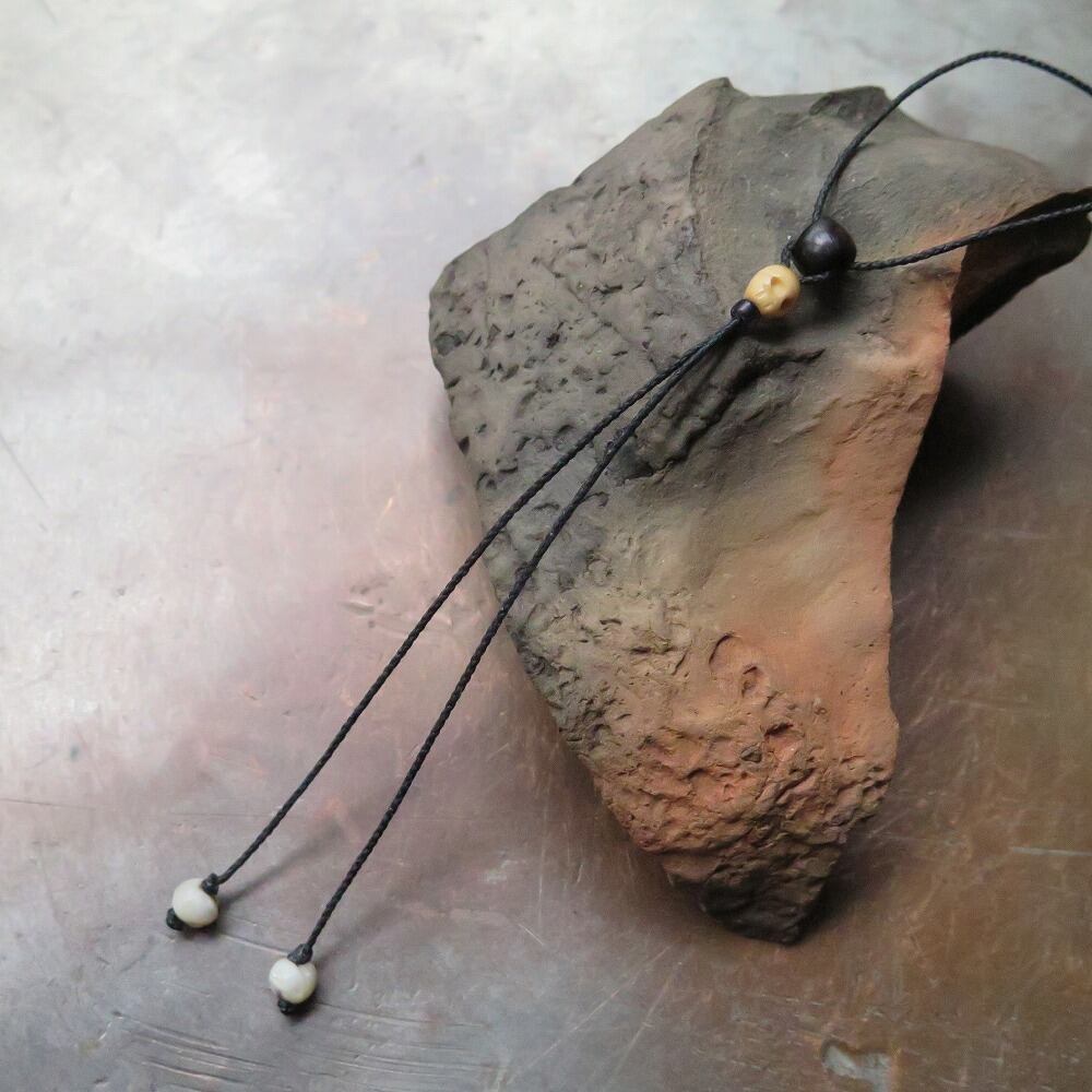 サイズ調整の為のビーズには、チベットでお数珠として使われていた紫檀と、小さなスカル(現代)を使いました。