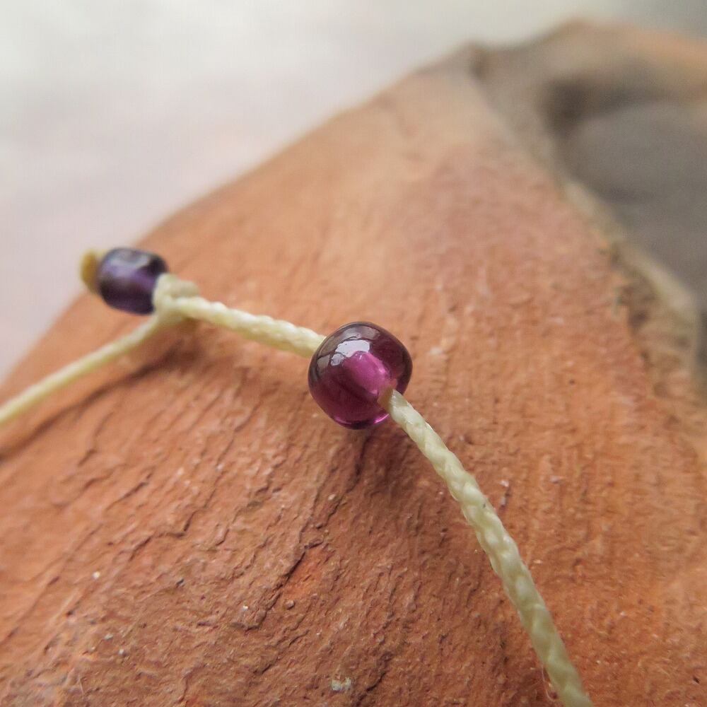 紐の先端にも、少し違う色味の紫のシードビーズを使いました。
