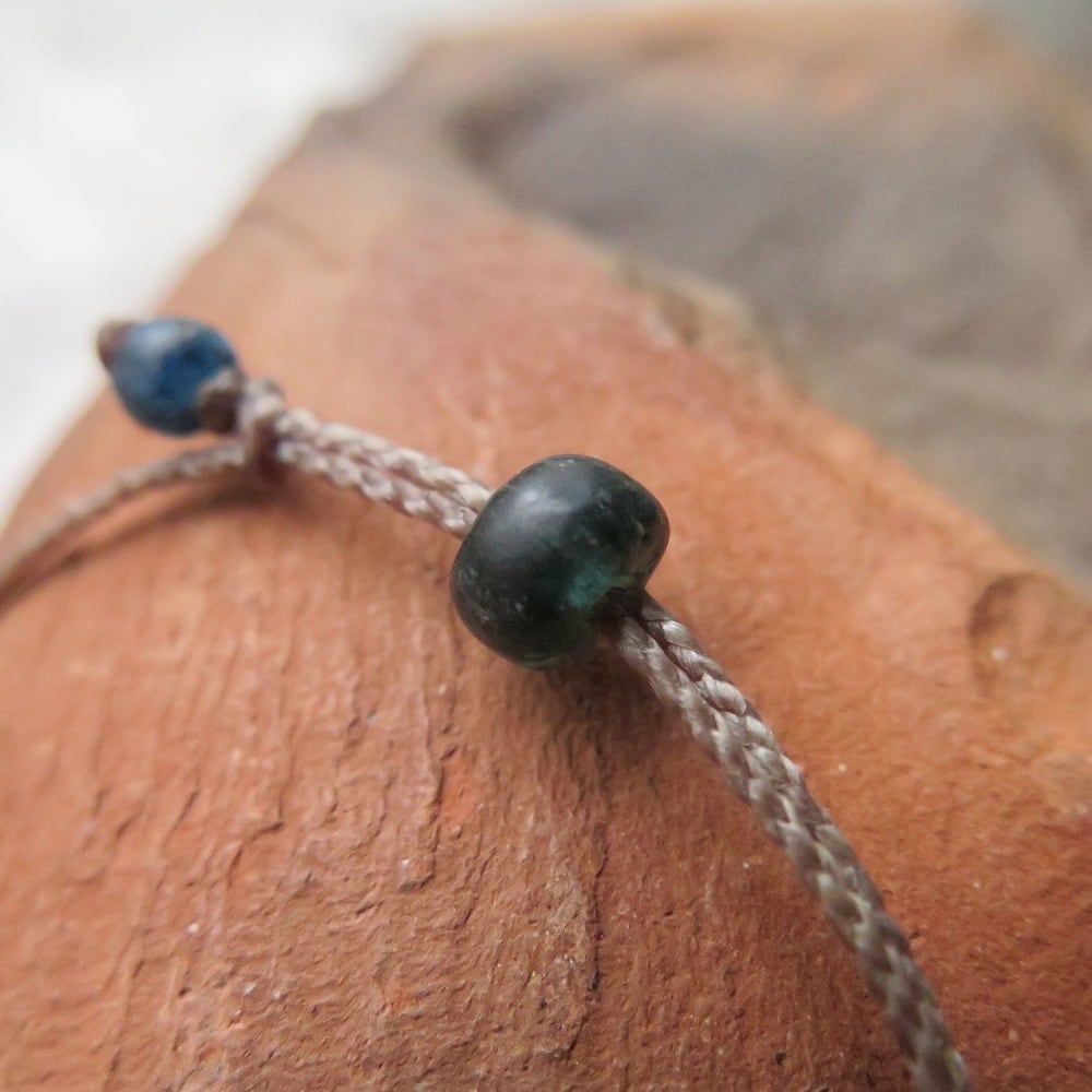 二本の紐をまとめるビーズ、紐の先端のビーズも、インドパシフィックビーズです。